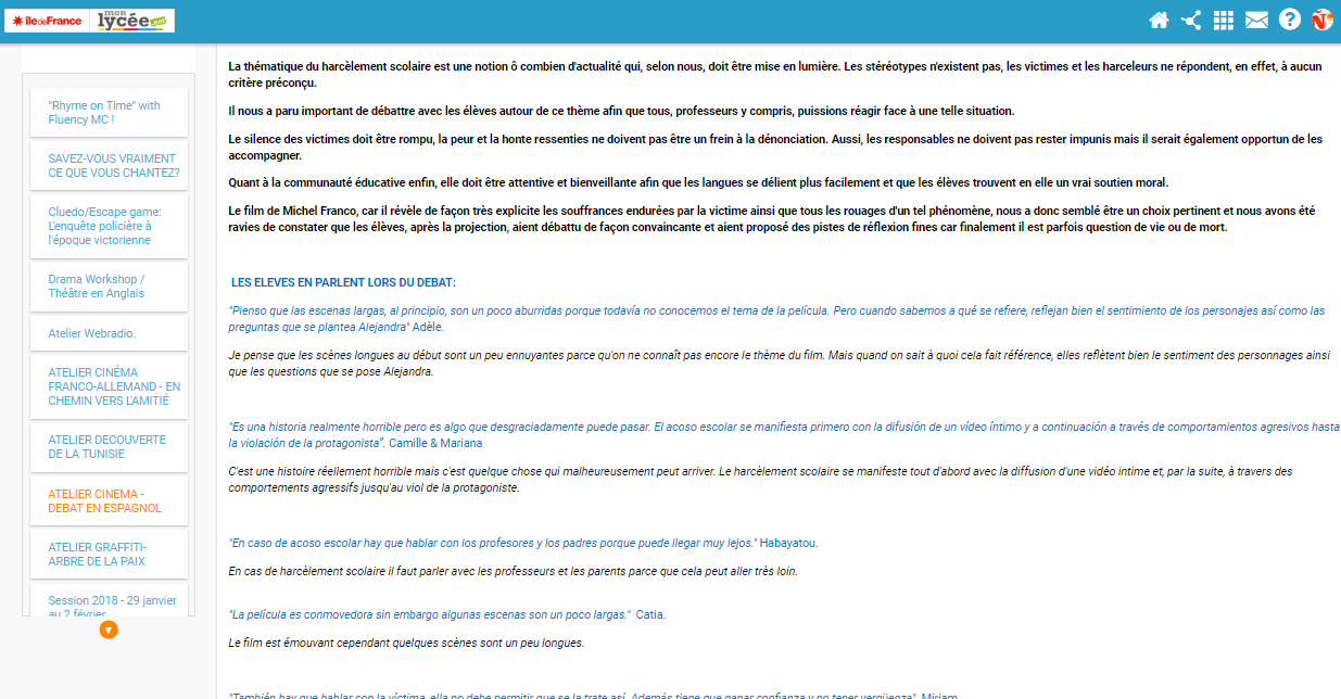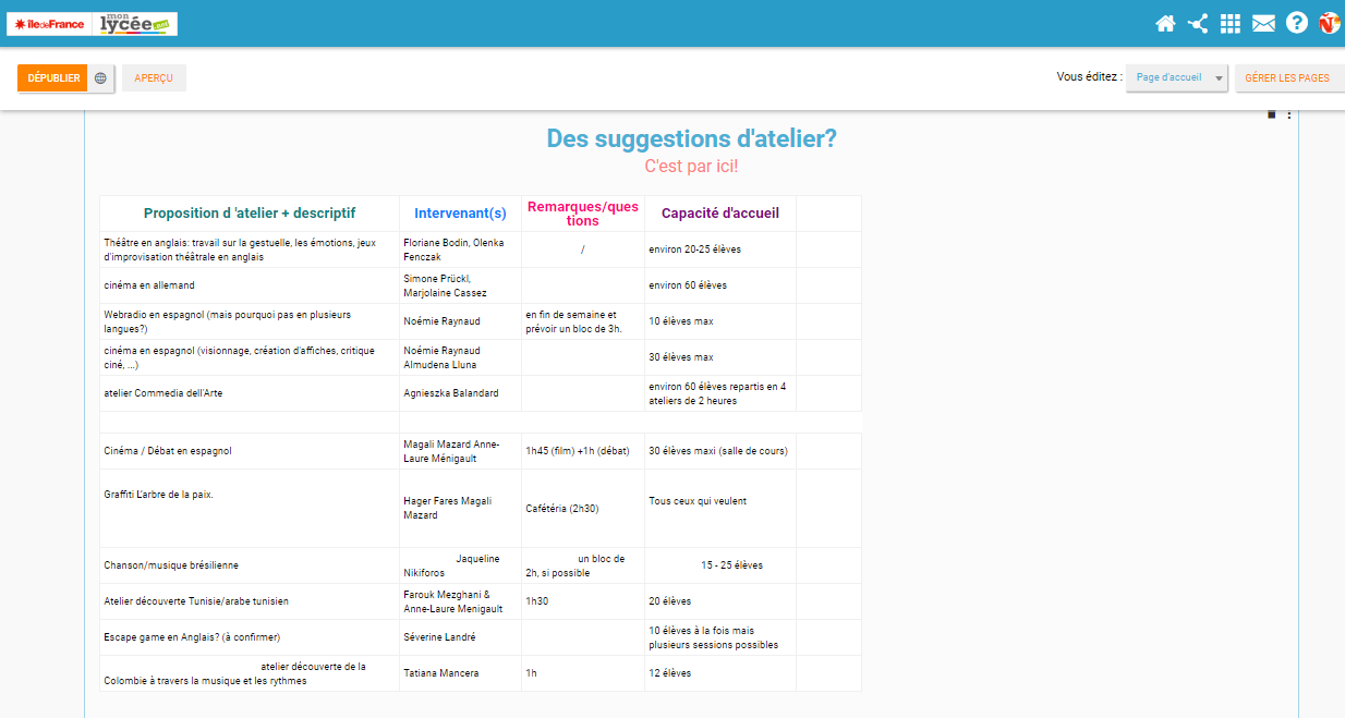 Au mois d’octobre 2017, le pôle langues décide d’utiliser l’ENT pour construire sa programmation d’ateliers pour la semaine des langues au lycée. Un espace collaboratif est construit pour permettre de recueillir les propositions des enseignants de langues.