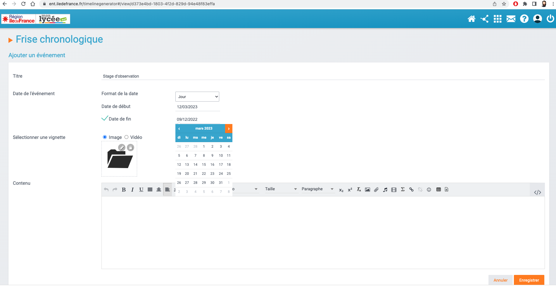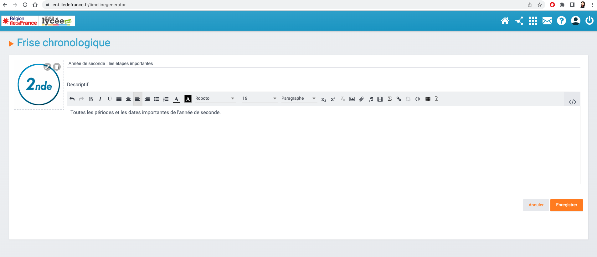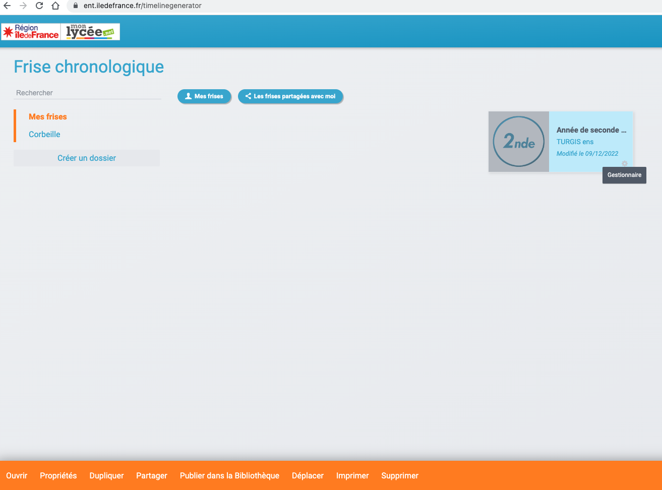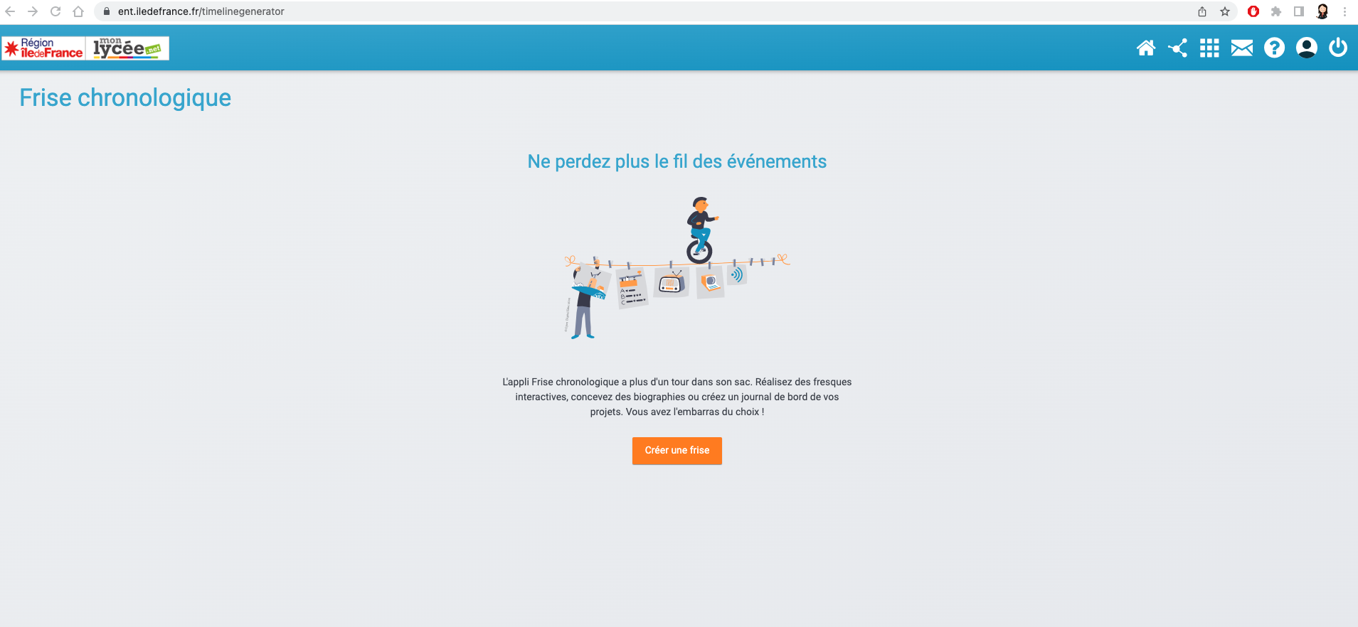 Depuis les applications de l’ENT, choisir l’outil frise chronologique puis créer une frise. Ensuite, il faut donner un nom, un descriptif et éventuellement un logo pour frise. Une fois la frise créée, celle-ci apparait dans la liste des frises.