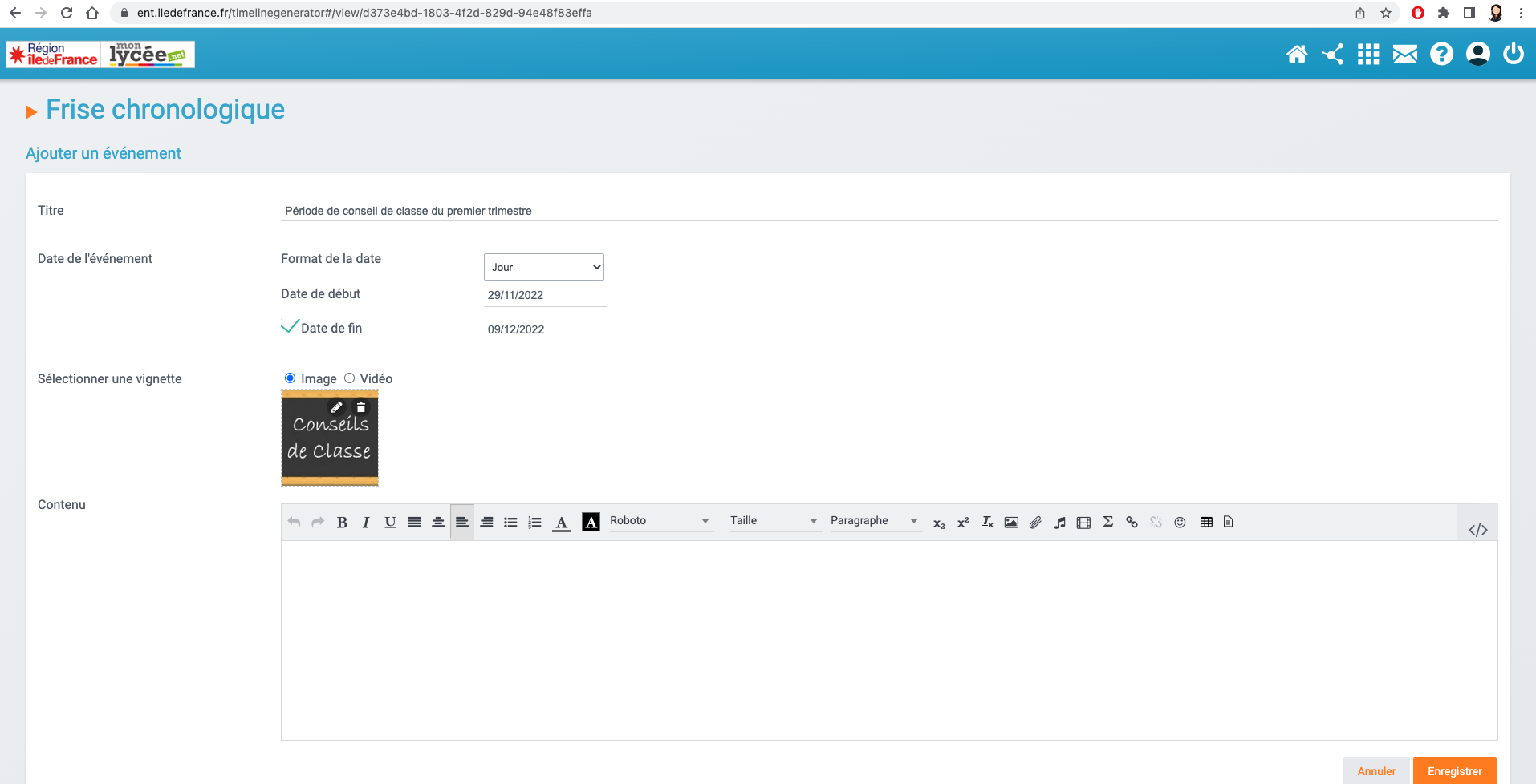 Une fois la frise créée, un onglet apparait qui permet d’ajouter des évènements ponctuels comme les dates de conseil de classe, de réunion parent-professeurs mais également des intervalles de temps comme pour les périodes de stage ou de processus Educonnect.