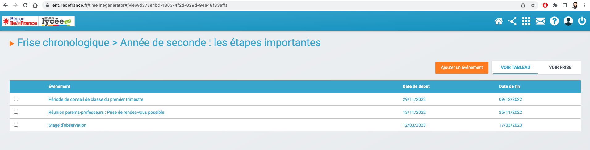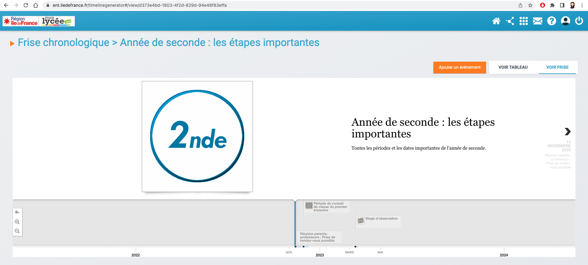 Les dates associées à Educonnect peuvent également y figurer et la frise peut être partagées non seulement avec les élèves mais également avec les parents.
