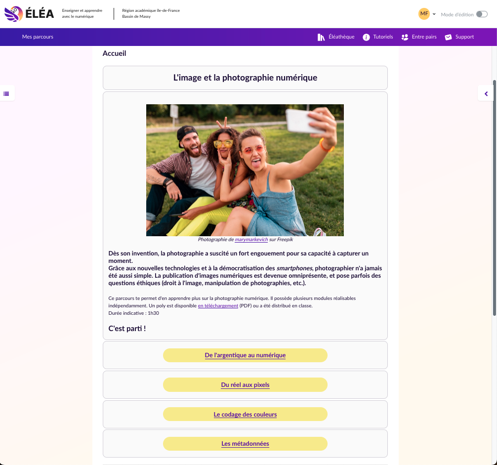 Ce parcours te permet d’en apprendre plus sur la photographie numérique. Il possède plusieurs modules réalisables indépendamment. Un poly est disponible en téléchargement (PDF) ou a été distribué en classe.