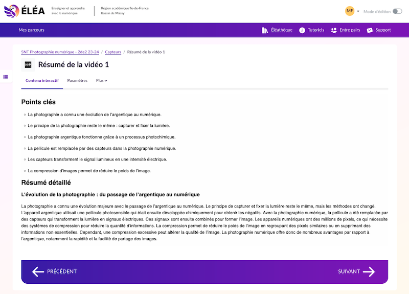 Capture de l’interface Éléa avec les points clés et le résumé intégrés.
