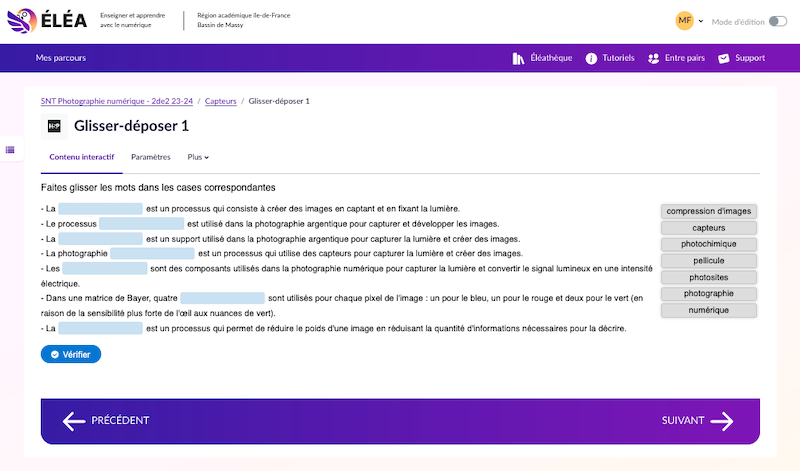 Capture de l’interface Éléa avec le H5P glisser-déposer de définitions intégré.