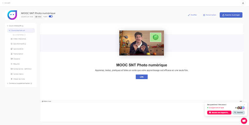 - Il y a toujours la possibilité de modifier les contenus générés, d’ajouter des questions, etc. Ceci est important car les questions notamment ne sont pas toujours pertinentes et parfois répétitives.