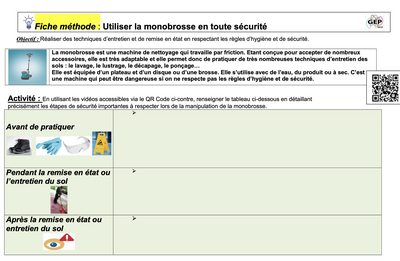 Cette fiche méthode explique comment utiliser une monobrosse en toute sécurité en détaillant les étapes de prévention à respecter avant, pendant et après son utilisation, à l’aide de vidéos accessibles via un QR code.