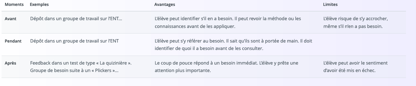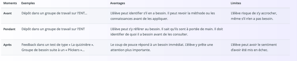 | Après | Feedback dans un test de type « La quizinière ». Groupe de besoin suite à un « Plickers »... | Le coup de pouce répond à un besoin immédiat. L’élève y prête une attention plus importante. | L’élève peut avoir le sentiment d’avoir été mis en échec. |
