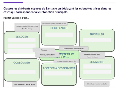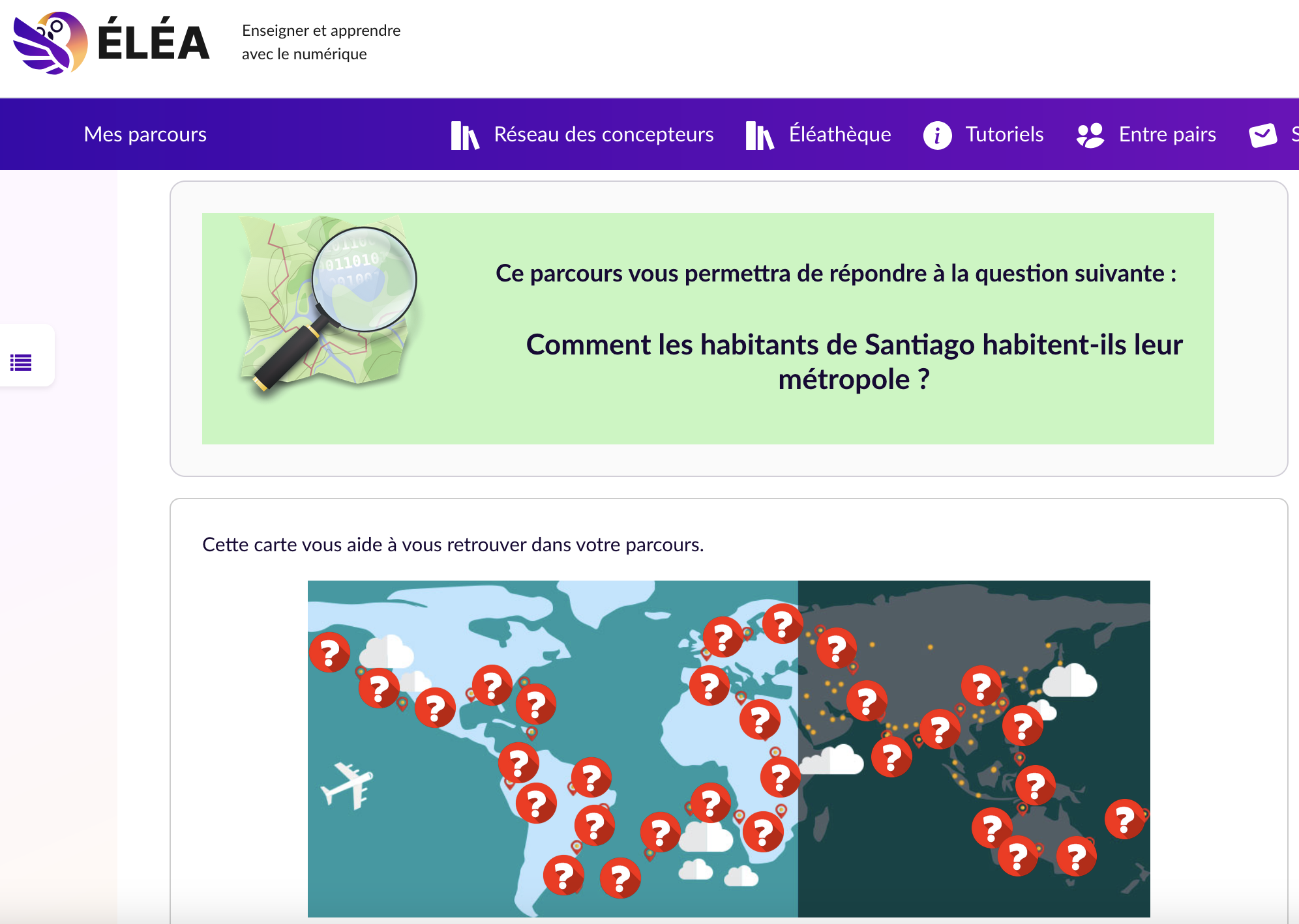 - En classe : l’enseignante introduit les notions et travaille les compétences (coopérer, mutualiser, pratiquer différents langages) par groupes ou binômes. Avec Éléa, il est possible de concevoir ses propres parcours ou d’utiliser des parcours partagés dans la éléathèque. C’est le cas du parcours présenté ci-dessous qui est une proposition pédagogique de Sylvain Hausard (académie de Grenoble) et Delphine Chiocci (académie de Lille). Ce parcours guide les élèves à travers l’étude du paysage urbain de Santiago, et leur permet d’acquérir la méthodologie et les étapes nécessaires pour concevoir un croquis géographique structuré.