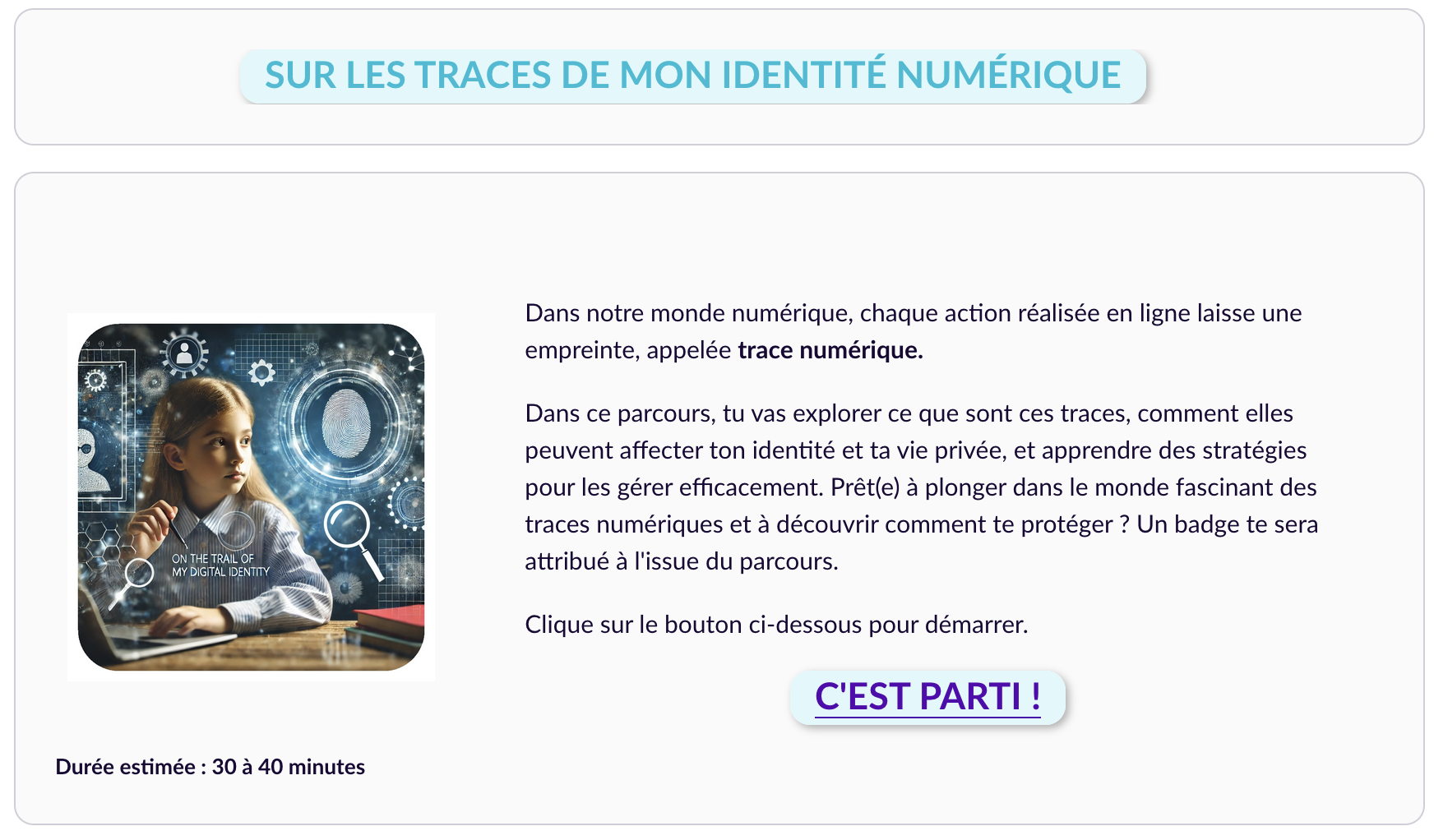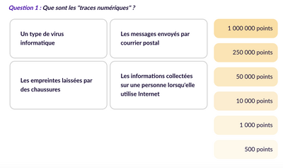 Le parcours dure environ 40 minutes et propose une progression interactive mêlant études de cas, quiz, mises en situation et supports visuels. Il commence par une activité de découverte : les élèves sont invités à réfléchir aux traces qu’ils laissent en ligne, souvent sans s’en rendre compte.