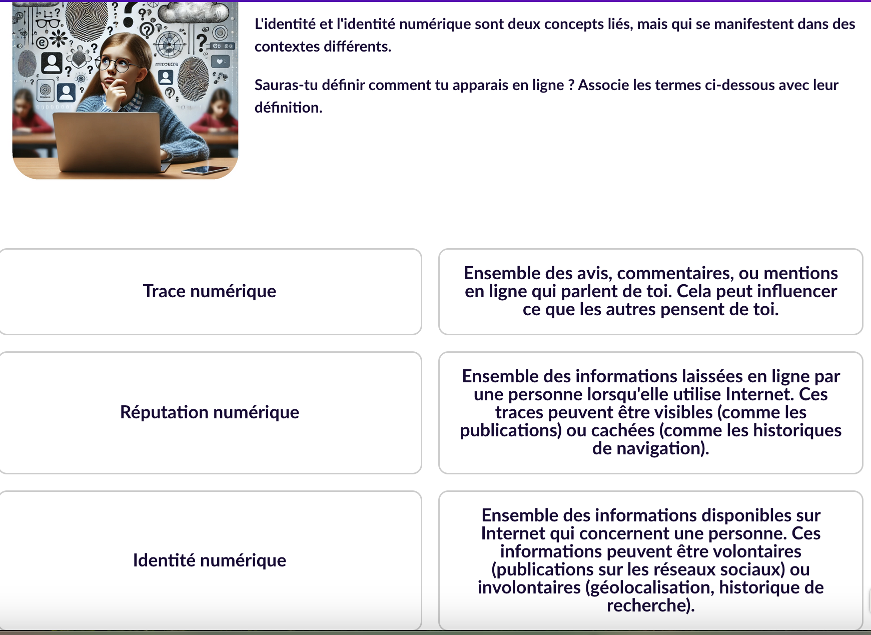 Sauras-tu définir comment tu apparais en ligne ? Associe les termes ci-dessous avec leur définition.