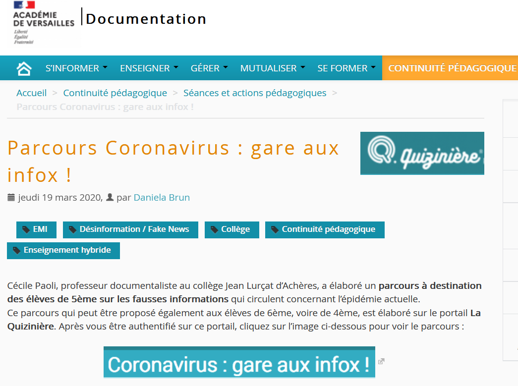 En cliquant sur l’image ci-dessous, vous trouverez un parcours à destination des élèves sur les Infox liées au Coronavirus proposé par l’Académie de Versailles.