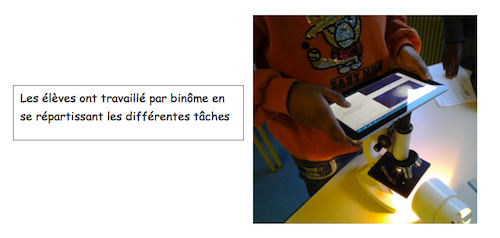 Les élèves ont ensuite pu réaliser le dessin d’observation sur leurs propres feuilles. On aurait pu envisager de mettre directement les légendes sur la photo en utilisant une application telle que « Skitch » par exemple et de noter le bilan sur le compte rendu.