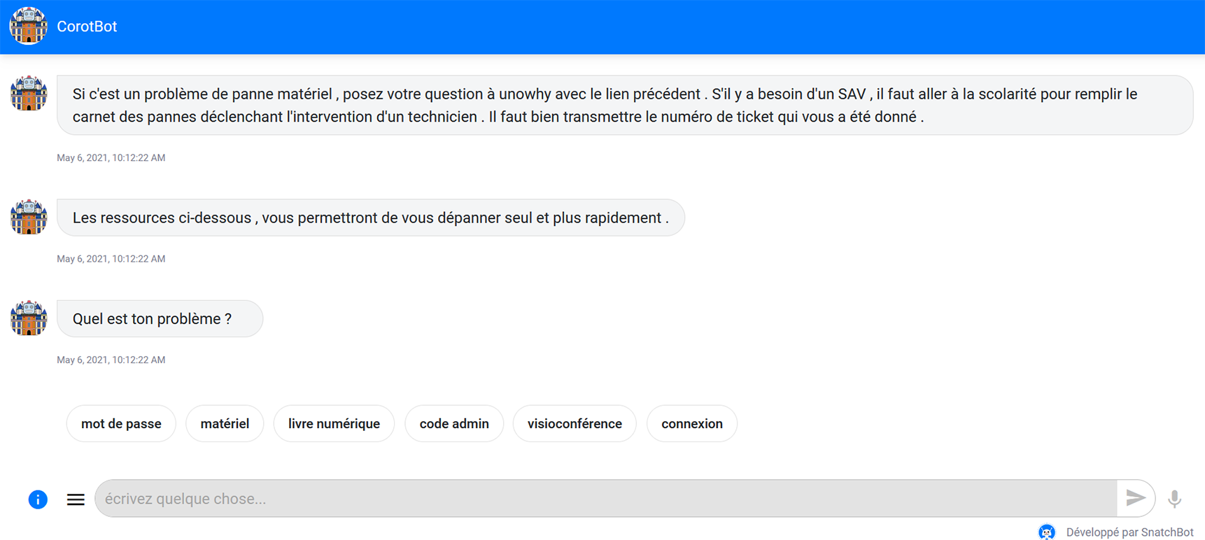 Le chatbot COROT est un portail interactif qui permet d’aiguiller les utilisateurs des services numériques du lycée COROT vers les bons interlocuteurs ainsi que sur la résolution des pannes les plus courantes .