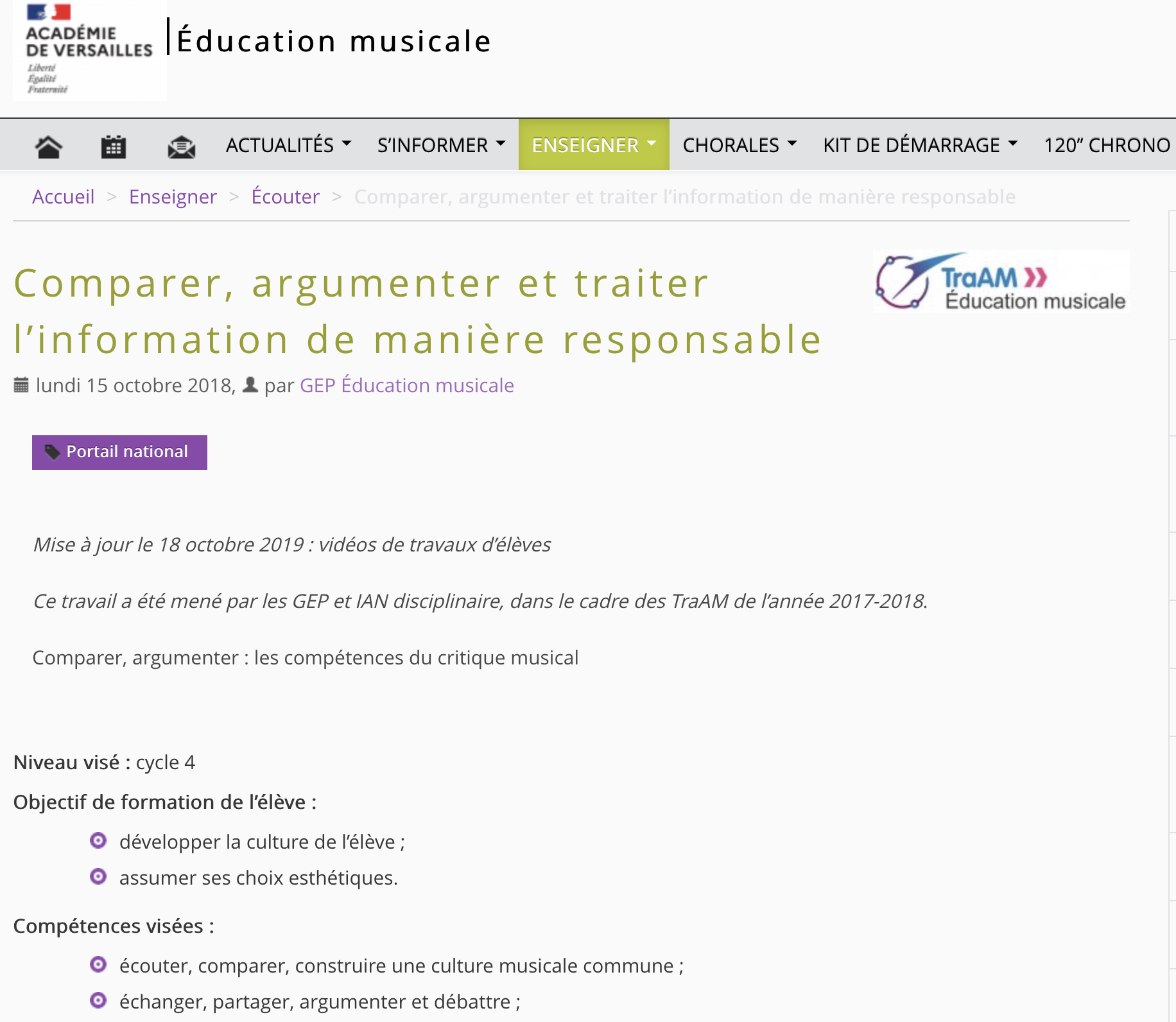 En cliquant sur l’image ci-dessous, vous trouverez un projet mené dans le cadre des TraAMs en éducation musicale sur le thème Comparer, argumenter et traiter l’information de manière responsable.
