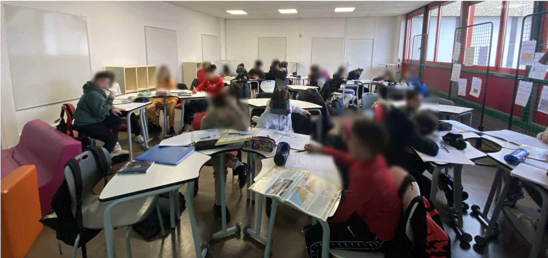 Panoramique de la salle de classe, les élèves sont positionnés en îlots, au sein de chaque îlot un élève porte un casque de réalité virtuelle.