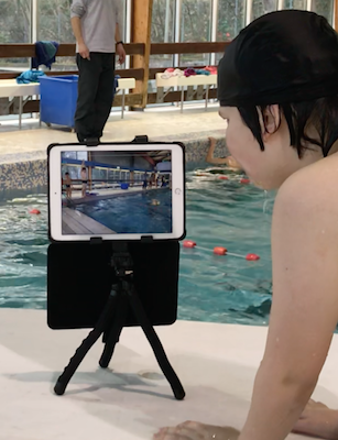 Au cours de cette séance de natation, dans une situation, j’ai utilisé l’appli « VideoDelay ». Elle permet aux élèves de réaliser la tâche que je leur propose et de venir regarder leur prestation quelques secondes après sur la tablette.
