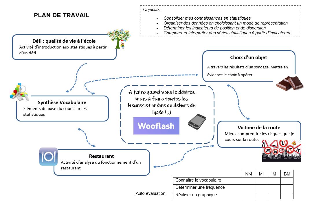 Plan de travail avec différentes étapes/activités délimitées par des blocs, au centre desquelles se trouve un bloc Wooflash : "à faire quand vous le désirez mais à faire toutes les heures et même en dehors du lycée".