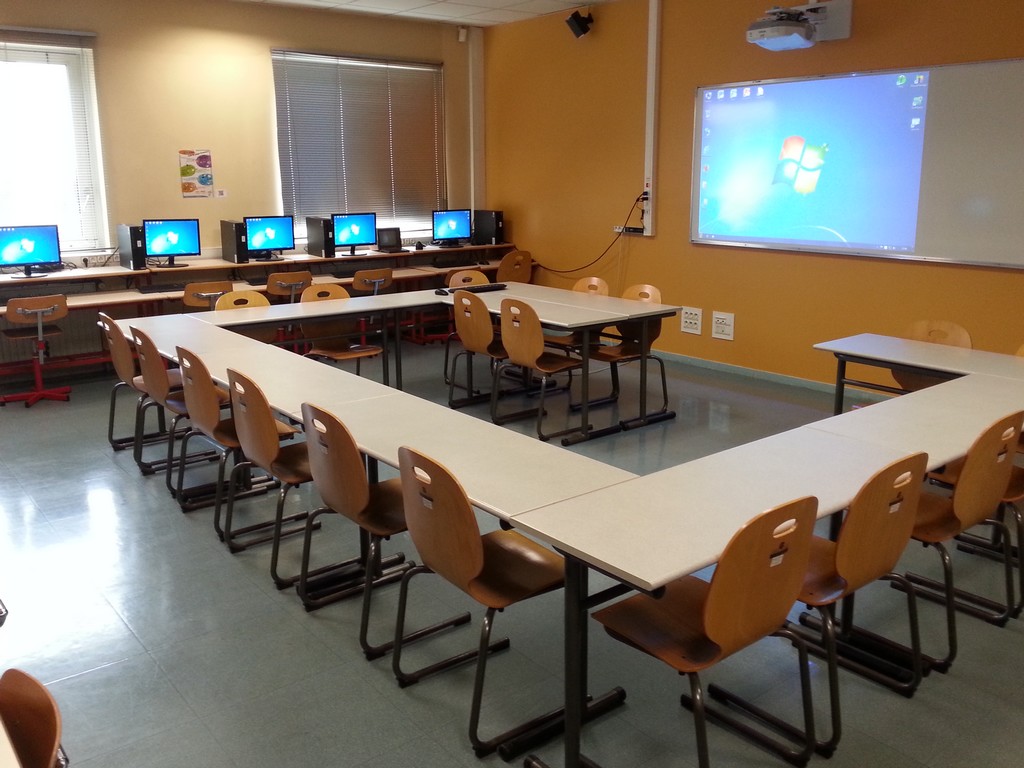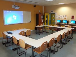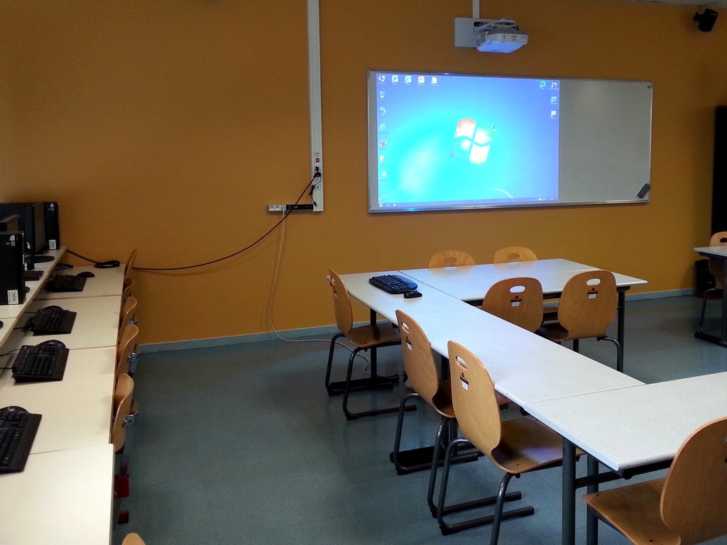 La salle de formation du médiapôle de Colombes est équipée de 14 ordinateurs stagiaires et d’un ordinateur formateur, ainsi que d’un vidéoprojecteur interactif (Epson EB-575WI, ports VGA et HDMI).