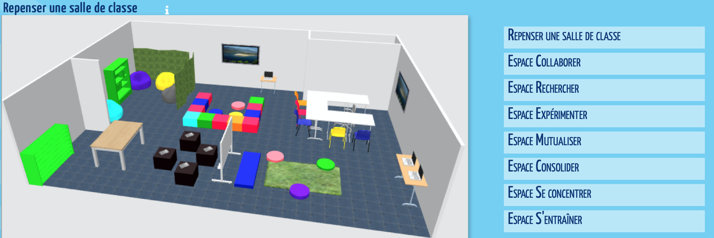 L’image représente la modélisation d’une salle de classe en 3D, avec des espaces diversifiés en termes d’assises, de tables, etc.