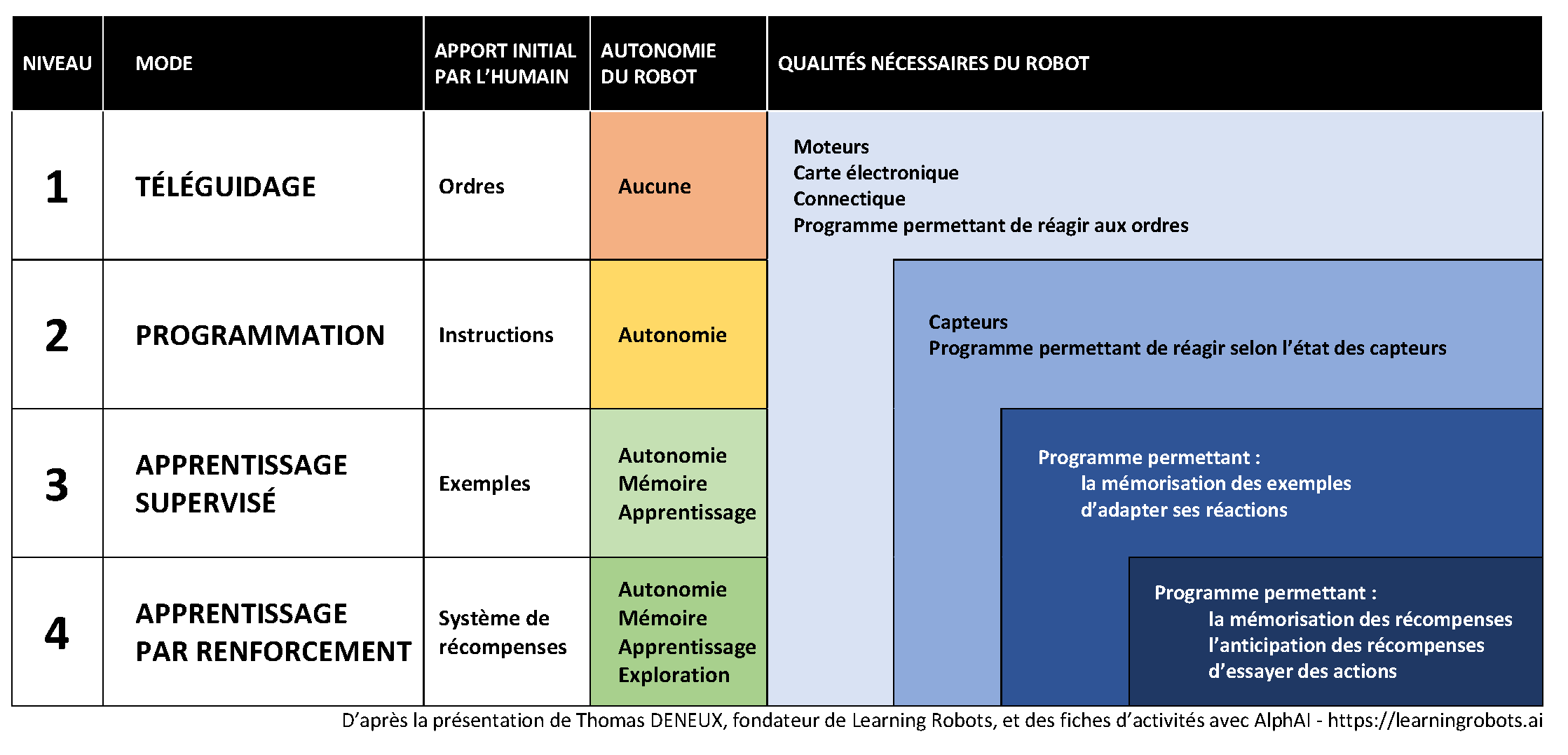 Différents modes d’apprentissage des robots sous forme d’un tableau.