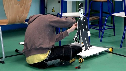 Le robot « Charlie Chaplin » est constitué d’une silhouette de l’acteur montée sur un plateau muni de quatre roues lui permettant de faire face au public quelle que soit la direction du déplacement. Un servo-moteur permet également d’animer la canne de Charlot. Un élève s’applique à cacher les fils reliant le moteur à la carte programmable fixée sur le plateau.