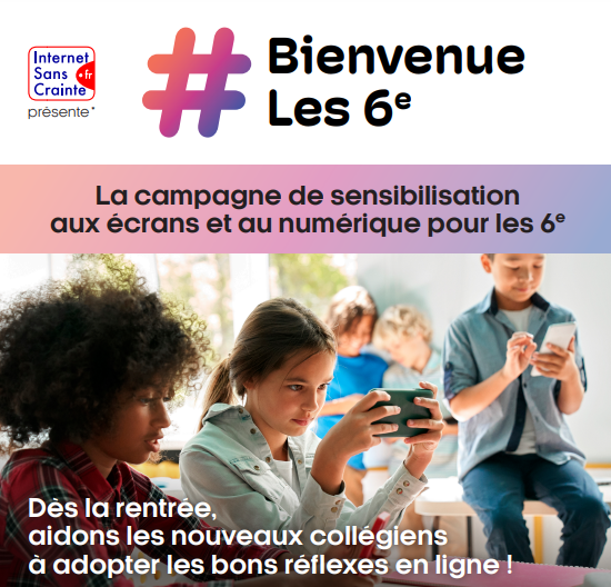 Logo : Internet Sans Crainte suivi du titre :#Bienvenue les 6è Des enfants sur des écrans. On peut lire le texte : - La campagne de sensibilisation aux écrans et au numérique pour les 6è - Dès la rentrée aidons les nouveaux collégiens à adopter les bons réflexes en ligne !