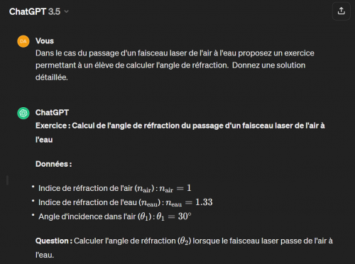 Dans le cas du passage d’un faisceau laser de l’air à l’eau proposez un exercice permettant à un élève de calculer l’angle de réfraction. Donnez une solution détaillée.