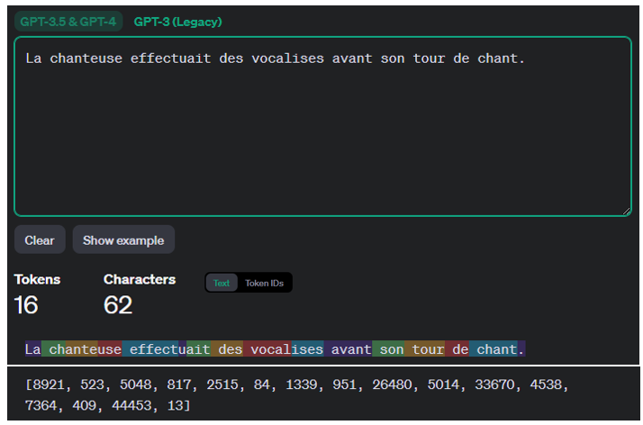Illustration du principe fonctionnement du tokeniser d’OpenAI à partir de la phrase « La chanteuse effectuait des vocalises avant son tour de chant ».