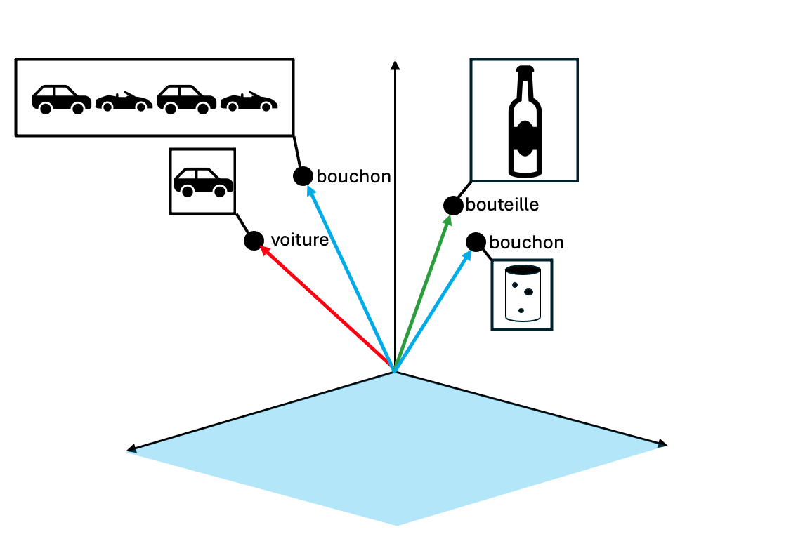 En particulier, cette représentation mathématique permet de rendre compte de la polysémie de certains mots liée au contexte dans lequel on les rencontre. Ainsi, par exemple le mot « bouchon » peut désigner à la fois l’objet permettant d’obturer une bouteille ou un blocage de la circulation routière. Dans ce cas de figure le mot « bouchon » sera représenté par deux vecteurs différents permettant à l’IA de saisir la nuance de sens en fonction du contexte.