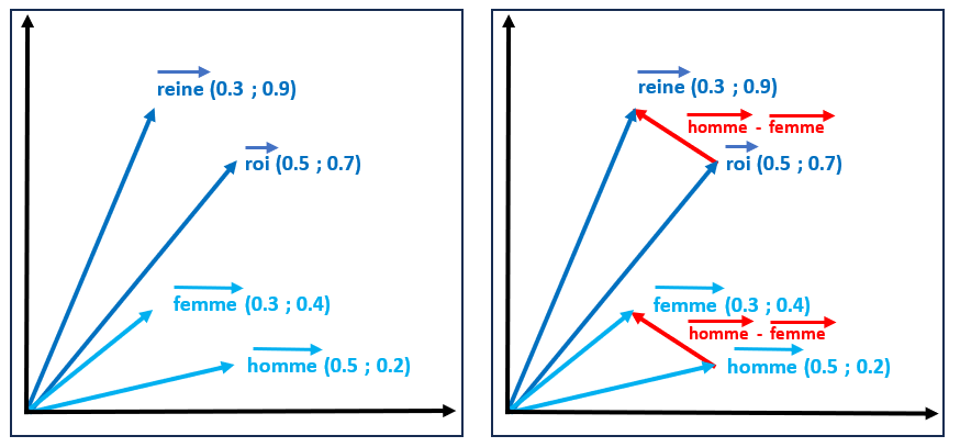 La vectorisation permet de capturer des relations sémantiques complexes dans l’espace vectoriel, en utilisant des opérations algébriques simples, telles que des additions et des soustractions, sur les vecteurs de mots. Par exemple si on demande à une IA générative d’indiquer le résultat de roi + (homme - femme) la réponse fournie sera le mot reine. Cela est assez facile à comprendre lorsque l’on réalise les constructions géométriques sur les vecteurs associés aux mots précédents. Remarquons en particulier que la soustraction vectorielle homme - femme permet d’extraire la différence sémantique entre ces deux mots à savoir le genre.