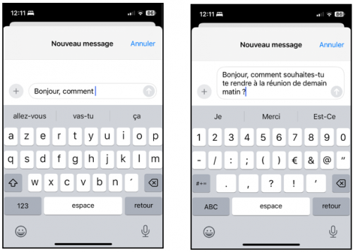Illustration de la suggestion automatique de mots dans l’application SMS d’un smartphone - Transciption