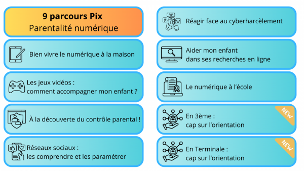 9 parcours Pix - Parentalité numérique : - Bien vivre le numérique à la maison - Les jeux vidéo : comment accompagner mon enfant ? - À la découverte du contrôle parental ! - Réseaux sociaux : les comprendre et les paramétrer - Réagir face au cyberharcèlement - Aider mon enfant dans ses recherches en ligne - Le numérique à l’école - En 3ème : cap sur l’orientation - En Terminale : cap sur l’orientation