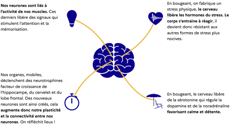 « Nos organes, mobiles, déclenchent des neurotrophines facteur de croissance de l’hippocampe, du cervelet et du lobe frontal. Des nouveaux neurones sont ainsi créés, cela augmente donc notre plasticité et la connectivité entre nos neurones. On réfléchit mieux ! »