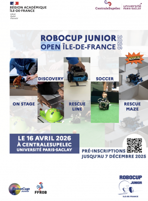 Cette année, la RoboCup Junior aura lieu le jeudi 16 avril 2026 sur le campus de CentraleSupélec (Université Paris saclay, 3 Rue Joliot Curie, 91190 Gif-sur-Yvette), site emblématique de l’excellence scientifique et technologique française.