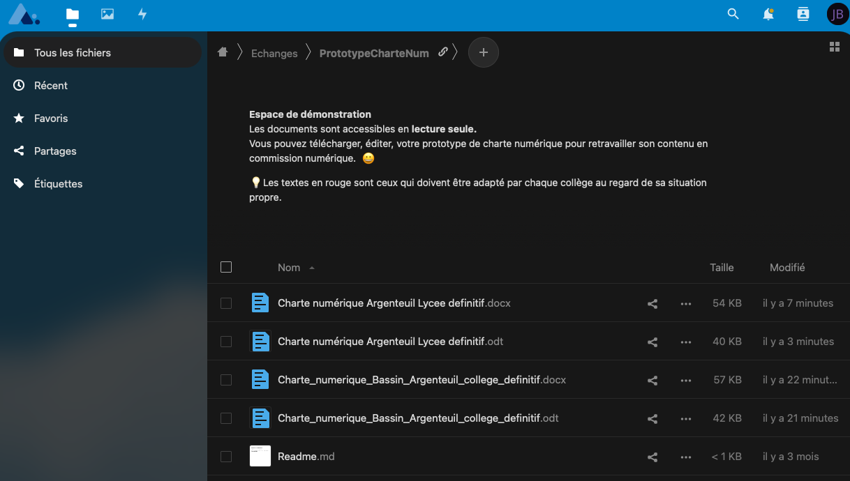 Capture de l’espace partagé dans Nuage, donnant accès au document de travail sur la charte.