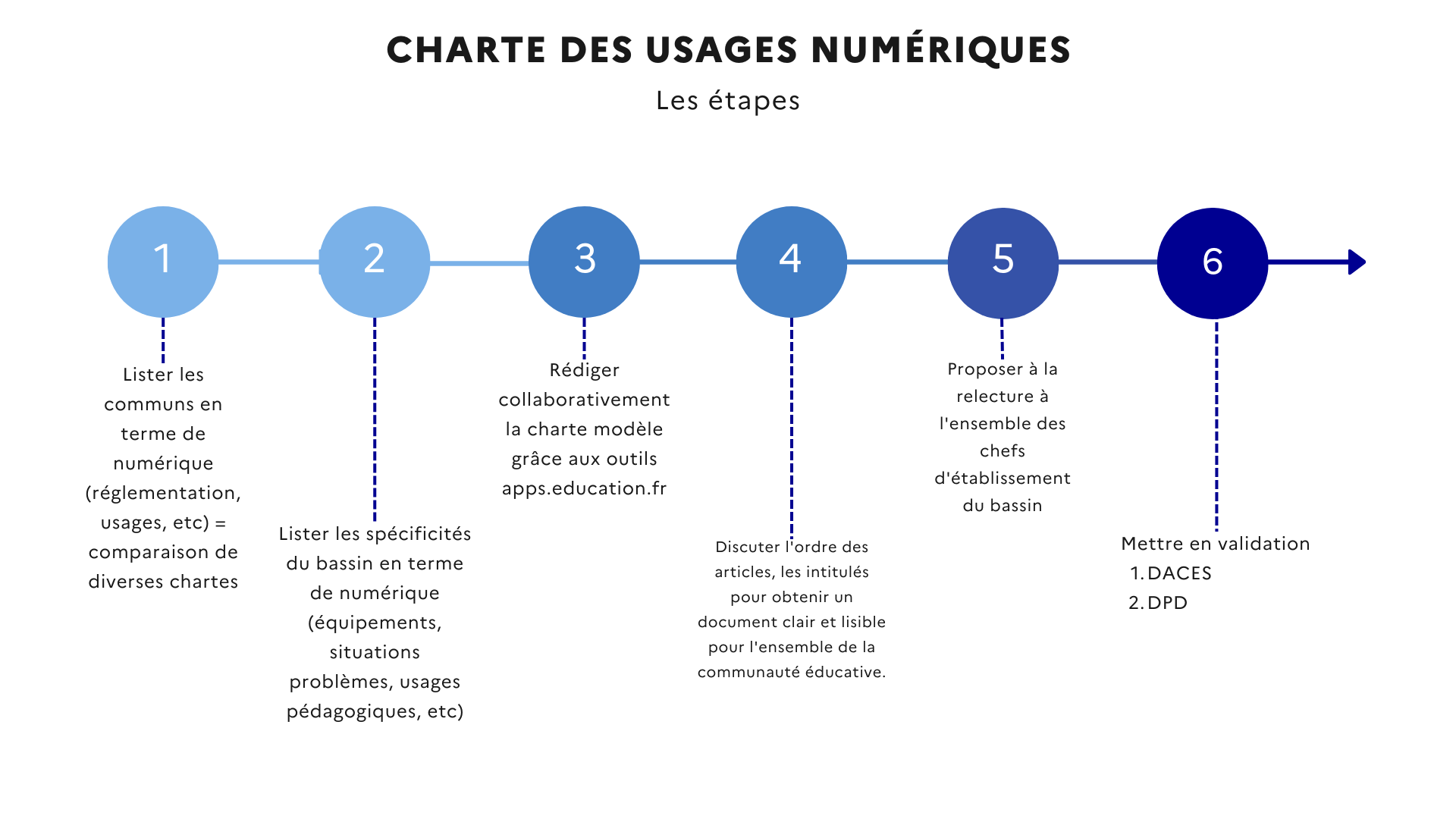 Les 6 étapes de la démarche de projet pour concevoir un modèle de charte numérique :