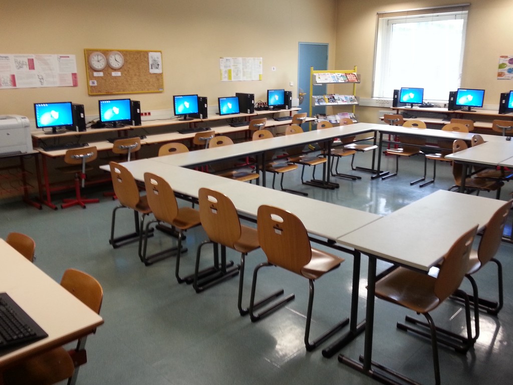 La salle de formation du médiapôle de Colombes est équipée de 14 ordinateurs stagiaires et d’un ordinateur formateur, ainsi que d’un vidéoprojecteur interactif (Epson EB-575WI, ports VGA et HDMI).