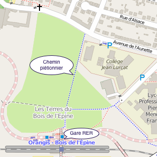 - RER D Station "Orangis Bois de l’Épine" (au départ de Paris Gare du Nord, Châtelet-Les-Halles, Gare de Lyon, Juvisy, Évry-Courcouronnes Centre)